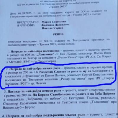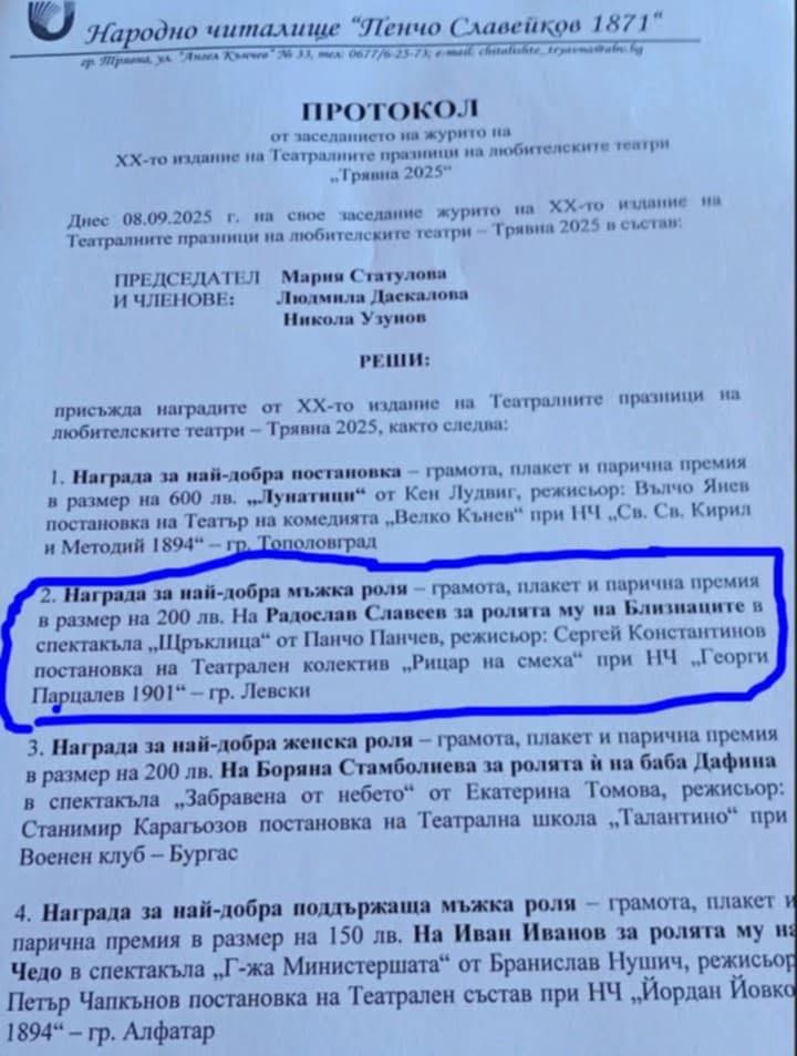 С гордост и радост Народно читалище „Георги Парцалев – 1901“ – гр. Левски съобщава, че нашият театрален състав „Рицар на смеха“ бе отличен с награда за най-добра мъжка роля на XX Театрални празници на любителските театри „Трявна – 2025“.